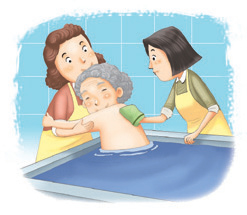 이동 목욕 차량 또는 이동식 욕조를 갖추고 요양보호사 2명이 한 조로 어르신의 가정을 방문해 목욕 서비스를 제공합니다.